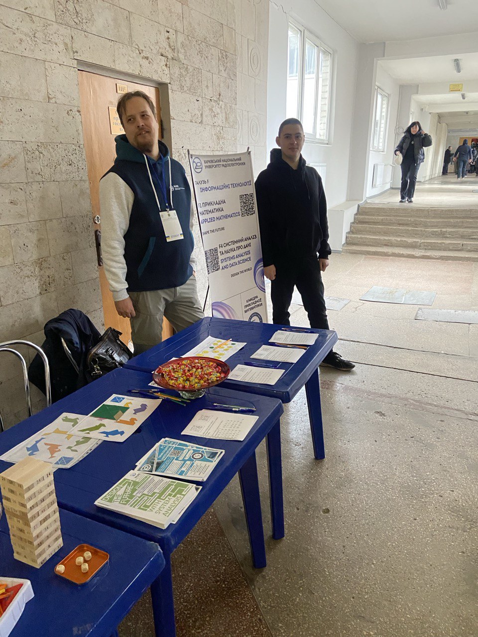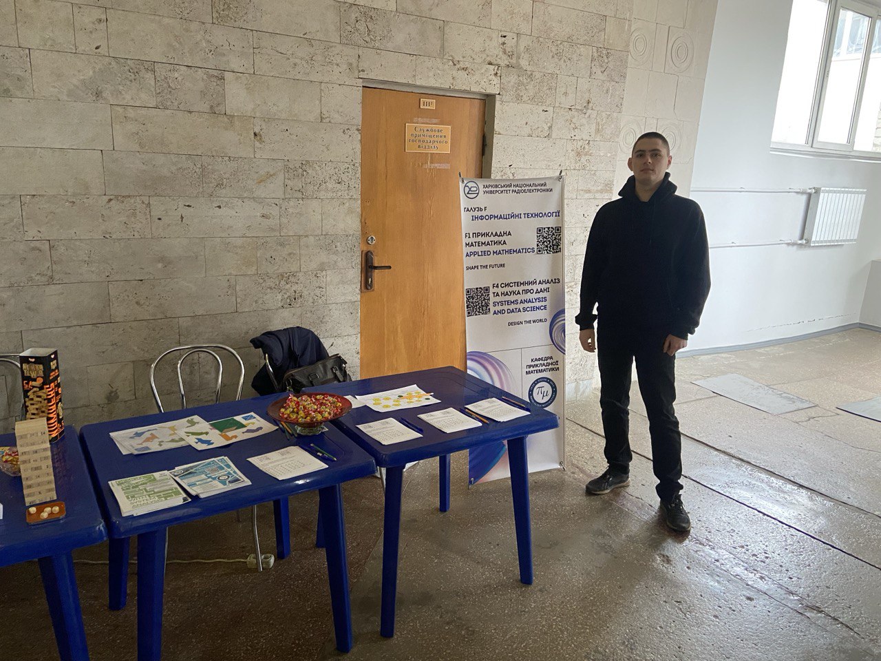 During the event, our lecturers, Vladyslav Parkhomenko and Mykyta Hvozdiev, conducted mathematical quests and quizzes. They presented the educational programs of the Department of Applied Mathematics, discussed prospects for professional development, and guided prospective students in choosing their future educational path.